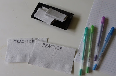 I provided some fabric for practicing and had lots of extra labels for any mistakes. I left the release paper on for stability while writing.